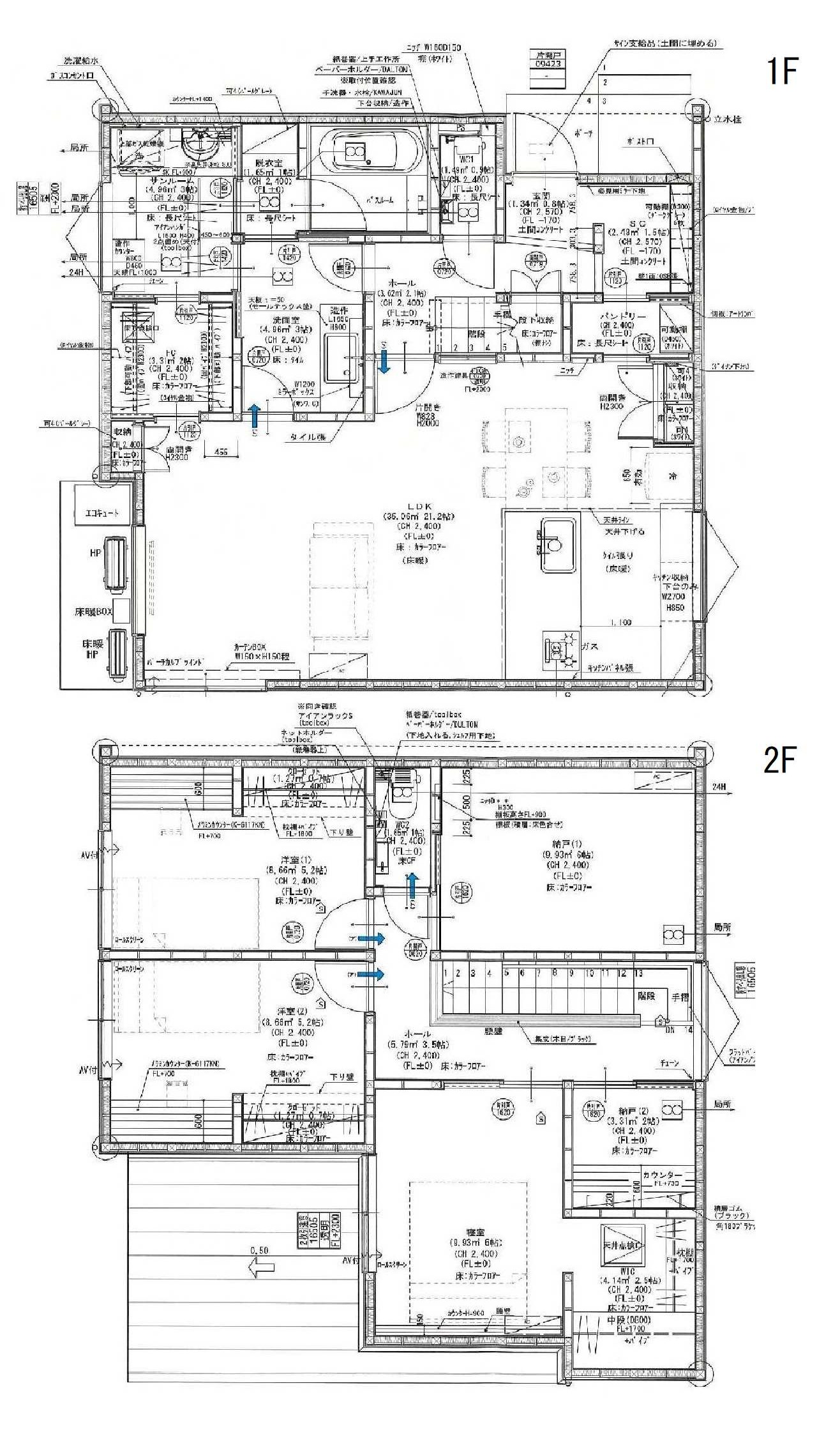 | 間取り | 1F:LDK21.1、ファミリークローク、洗面、浴室、トイレ、サンルーム、シューズクローク 2F:洋室6+ウォークインクローゼット2.5、洋室5.2、洋室5.2、サービスルーム6、書斎2、トイレ |